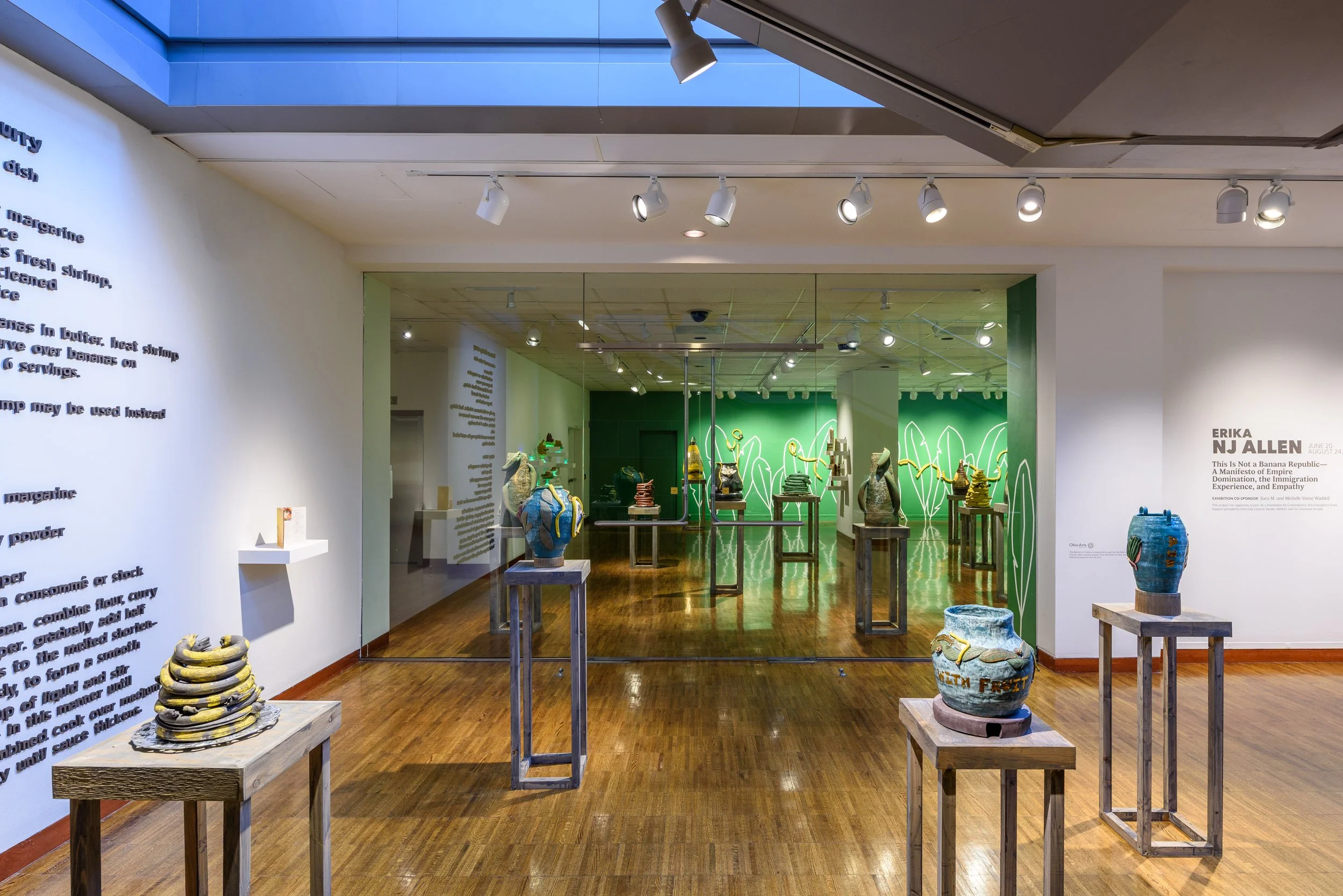 Born in Guatemala, and currently residing in Cincinnati, OH where she teaches at the Art Academy of Cincinnati, Erika NJ Allen creates immersive mixed-media installations exploring her personal journey and the broader immigrant experience. This is Not a Banana Republic unfolds as a symbolic battleground depicted through clay sculptures, and evocative photography. Here, the resilience of the human body stands as a defiant gesture against oppressive systems. The banana, once a simple fruit, emerges as a potent metaphor for the artist's struggle and the enduring war against the immigrant experience.